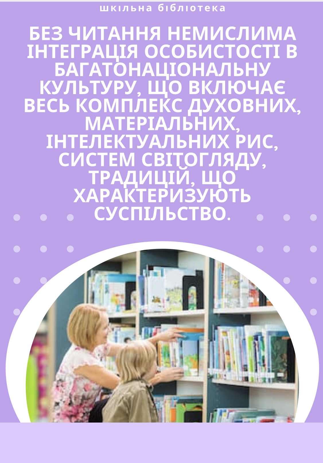 Бібліотека – це бібліотечно-інформаційний центр. Навчально– виховний процес школи повинен бути спрямований на виховання в учнів культури та творчості. Вона повинна забезпечувати саморозвиток особистості, духовний розвиток, навчити їх мистецтву жити. Саме у цьому процесі має брати участь шкільна бібліотека.
